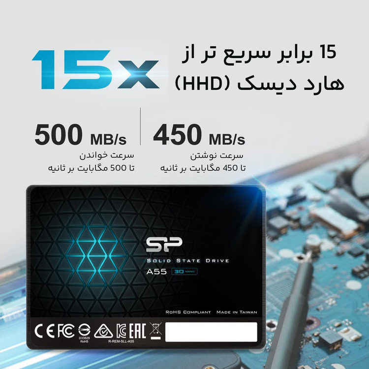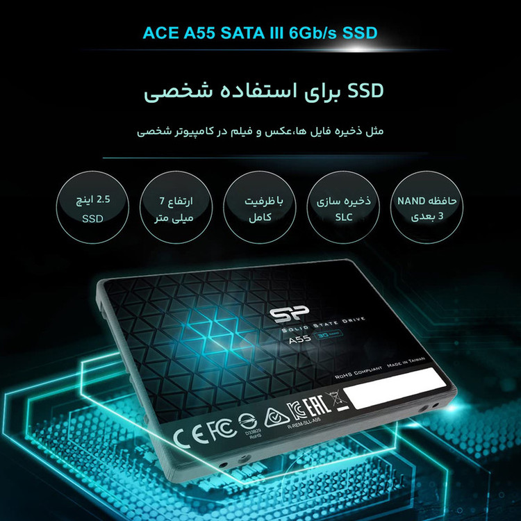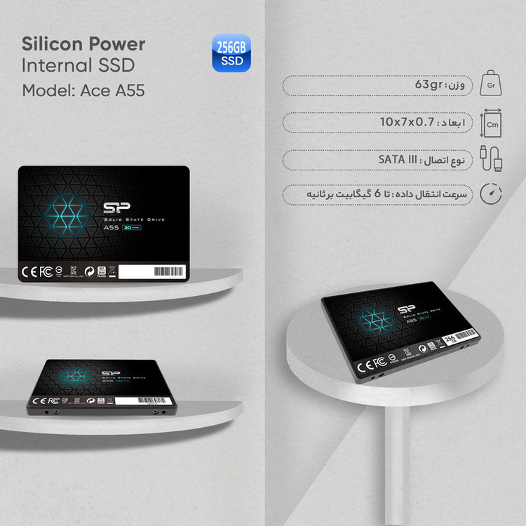 حافظه SSD «سیلیکون پاور» مدل «Ace A55» از طریق رابط SATA3.0 به کامپیوتر متصل میشود. میزان ظرفیت این محصول برابر با 256 گیگابایت است که مقدار مناسبی برای کاربرانی است که اطلاعات زیادی برای ذخیرهسازی ندارند یا نمیخواهند هزینهی زیادی را برای داشتن یک حافظهی SSD متقبل شوند. سرعت خواندن در این محصول برابر با 550 مگابایت و سرعت نوشتن در آن برابر با 450 مگابایت است. اس اس دیها برای ذخیرهسازی اطلاعات از قسمت حرکتی و مکانیکی استفاده نمیکنند. این موضوع باعث میشود که بتوان اطلاعات را با سرعت بیشتری ذخیره کرد و از طرفی مقاومت محصول در برابر آسیبهایی مانند شوک، لرزش و ضربه بیشتر باشد. این محصول شرکت سیلیکون پاور در برابر ضربه، لرزش و شوک مقاوم است که این موضوع باعث پایدارماندن اطلاعات میشود. در واقع SSDها تجهیزاتی با قابلیت اتکای بسیار بالا هستند. میزان مقاومت Ace A55 در برابر شوک 1500G است. این محصول از نسل جدید چیپست 3D NAND بهره میبرد. سیلیکون پاور از برندهای معتبر در تولید تجهیزات ذخیرهسازی است که همواره محصولاتی را با کیفیت بالا و قیمت مناسب روانهی بازار میکند.