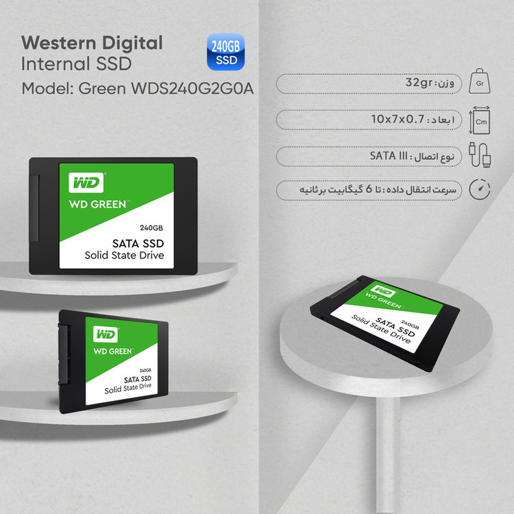 اس اس دی «گرین» محصولی از شرکت «وسترن دیجیتال» است که از طریق رابط SATA3.0 به کامپیوتر و لپ تاپ متصل میشود. این اس اس دی در گروه ذخیرهسازهای سری سبز شرکت وسترن قرار میگیرد که برای مصارف معمولی گزینهی مناسبی هستند. اس اس دی گرین میتواند با سرعت 545 مگابایت بر ثانیه اطلاعات را بخواند. ظرفیت 240 گیگابایتی این محصول برای کاربرانی که اطلاعات زیادی برای آرشیو دارند، مناسب است. این SSD از طریق رابط SATA3.0 به کامپیوتر متصل میشود. به راحتی میتوان این محصول شرکت وسترن دیجیتال را در کامپیوتر و لپ تاپ قرار داده و از آن بهره برد. SSDها بر خلاف هارددیسکها برای ذخیره اطلاعات از هیچ قسمت مکانیکی استفاده نمیکنند. این موضوع باعث شده که در برابر بسیاری از صدمات مقاوم باشند. اس اس دی گرین تا 1500G در برابر شوک مقاوم است. این اس اس دی مصرف انرژی بسیار کمی دارد که این موضوع باعث میشود که هنگام اتصال آن به لپ تاپ باتری لپ تاپ شارژدهی بیشتری نسبت به قبل داشته باشد.