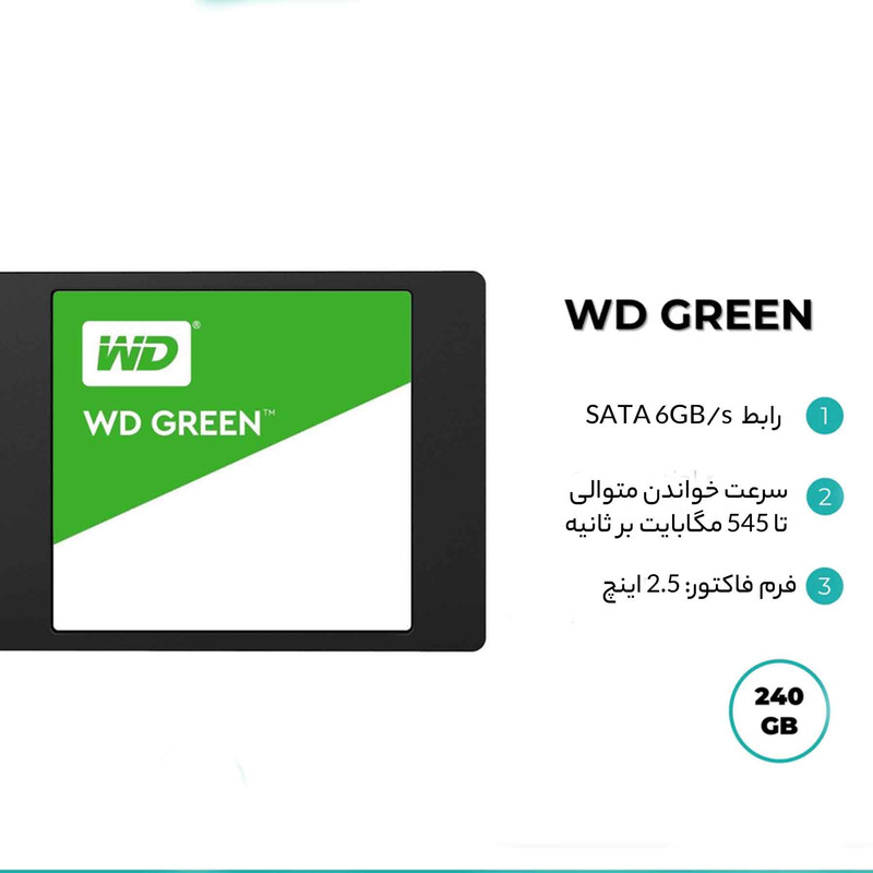 اس اس دی «گرین» محصولی از شرکت «وسترن دیجیتال» است که از طریق رابط SATA3.0 به کامپیوتر و لپ تاپ متصل میشود. این اس اس دی در گروه ذخیرهسازهای سری سبز شرکت وسترن قرار میگیرد که برای مصارف معمولی گزینهی مناسبی هستند. اس اس دی گرین میتواند با سرعت 545 مگابایت بر ثانیه اطلاعات را بخواند. ظرفیت 240 گیگابایتی این محصول برای کاربرانی که اطلاعات زیادی برای آرشیو دارند، مناسب است. این SSD از طریق رابط SATA3.0 به کامپیوتر متصل میشود. به راحتی میتوان این محصول شرکت وسترن دیجیتال را در کامپیوتر و لپ تاپ قرار داده و از آن بهره برد. SSDها بر خلاف هارددیسکها برای ذخیره اطلاعات از هیچ قسمت مکانیکی استفاده نمیکنند. این موضوع باعث شده که در برابر بسیاری از صدمات مقاوم باشند. اس اس دی گرین تا 1500G در برابر شوک مقاوم است. این اس اس دی مصرف انرژی بسیار کمی دارد که این موضوع باعث میشود که هنگام اتصال آن به لپ تاپ باتری لپ تاپ شارژدهی بیشتری نسبت به قبل داشته باشد.