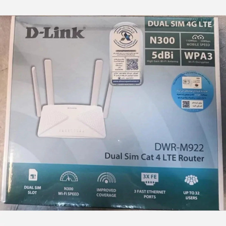 مودم روتر DWR-M922 از شرکت دی لینک (D-Link) دستگاهی با ظاهر جمع وجور و جذاب و رنگ کاملا سفید می باشد. مودم 922 مجهز به چهار آنتن و از سری مودم سیم کارت خور نسل N می باشد. از هر مکانی شما را به راحتی به اینترنت پهن باند مخابرات یا اینترنت سیم کارت3G/4G متصل می کند. بعد از متصل شدن شما به اینترنت پر سرعت دسترسی پیدا کرده و می توانید در وب جستجو کنید، و از تمام خدمات اینترنت به طور کامل بهره مند شوید. شما می توانید از طریق شبکه بیسیم اینترنت سیم کارت خود را به اشتراک بگذارید یا به هر یک از سه پورت 100/10 اترنت برای اتصال به اینترنت استفاده کنید. ویژگی منحصر به فردی که مودم DWR-M922 دارد پشتیبانی از دو سیم کارت می باشد که نسبت به سایر مودم سیم کارت خور های توی بازار متفاوت و خاص کرده است. این مودم با پشتیبانی از دو سیم کارت به کاربر اجازه می دهد دو سیم کارت (سیم کارت A فعال، سیم کارت پشتیبان B) را برای مودم قرار دهد. پورت WAN اترنت به شما امکان می دهد مودم GPON کابلی DSL را به عنوان پیوند اصلی یا پشتیبان متصل کنید. هر زمان که پیوند WAN گم شود به طور خودکار به شبکه LTE شما متصل می شود. مودم روتر همراه از فایروال های دوگانه فعال (SPI و NAT) برای جلوگیری از نفوذ ناخواسته احتمالی اینترنت استفاده می کند. رمزگذاری بی سیم WPA/WPA2/WPA3 شبکه بی سیم و ترافیک شما را ایمن نگه می دارد و به شما این امکان را می دهد که بدون نگرانی از دسترسی کاربران غیرمجاز به شبکه، اتصالات 4G یا 3G خود را ایمن به اشتراک بگذارید. ********************************************************* *رابط ها: پورت RJ-45 LAN /شیار سیم کارت/ پورت RJ-45 WAN *تعداد پورت شبکه: سه عدد (10/100) *فرکانس قابل پشتیبانی: 2.4 گیگاهرتز *شبکههای قابل پشتیبانی: 3G , 4G , LTE *نوع اتصال: بیسیم و باسیم *تعداد آنتن: چهار آنتن *حداکثر کاربر قابل پشتیبانی: 32 کاربر *قدرت آنتن: 5dBi *قابلیت پشتیبانی از SMS: دارد *پورت USB: -