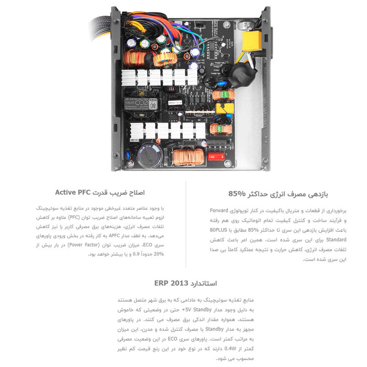 مناسب برای کاربردهای خانگی / اداری میباشد. قابلیت ارائه توان نامی حتی در دمای محیط حداکثر 40C را دارد. دارای مدار تصحیح ضریب توان (Active PFC) با عملکرد بالاتر از 0.90 در شرایط اعمال بار %20 الی %100 میباشد. بهرهمندی از خازن های درجه 1 ساخت کمپانی SamXon از نوع 85C در بخش اولیه است. بهره مندی از فیلترهای CLC به جهت بهبود دقت در رگولاسیون ولتاژ و کاهش ریپل خروجی است. دارای بازدهی مصرف انرژی (Efficiency) بالا مطابق با 80Plus Standard است. دارای میزان مصرف انرژی کمتر از 0.5W در حالت Stand By مطابق با جدیدترین اصلاحات بار ERP 2013 است. Hold-Up Time حدوداً 12ms حتی در بار %100 میباشد. مجهز به فیلتر دو مرحله ای EMI در بخش ورودی است. دراای فن فوقالعاده کم صدا با عملکرد هوشمند است.