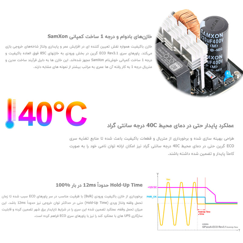 مناسب برای کاربردهای خانگی / اداری میباشد. قابلیت ارائه توان نامی حتی در دمای محیط حداکثر 40C را دارد. دارای مدار تصحیح ضریب توان (Active PFC) با عملکرد بالاتر از 0.90 در شرایط اعمال بار %20 الی %100 میباشد. بهرهمندی از خازن های درجه 1 ساخت کمپانی SamXon از نوع 85C در بخش اولیه است. بهره مندی از فیلترهای CLC به جهت بهبود دقت در رگولاسیون ولتاژ و کاهش ریپل خروجی است. دارای بازدهی مصرف انرژی (Efficiency) بالا مطابق با 80Plus Standard است. دارای میزان مصرف انرژی کمتر از 0.5W در حالت Stand By مطابق با جدیدترین اصلاحات بار ERP 2013 است. Hold-Up Time حدوداً 12ms حتی در بار %100 میباشد. مجهز به فیلتر دو مرحله ای EMI در بخش ورودی است. دراای فن فوقالعاده کم صدا با عملکرد هوشمند است.