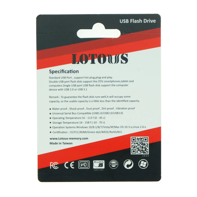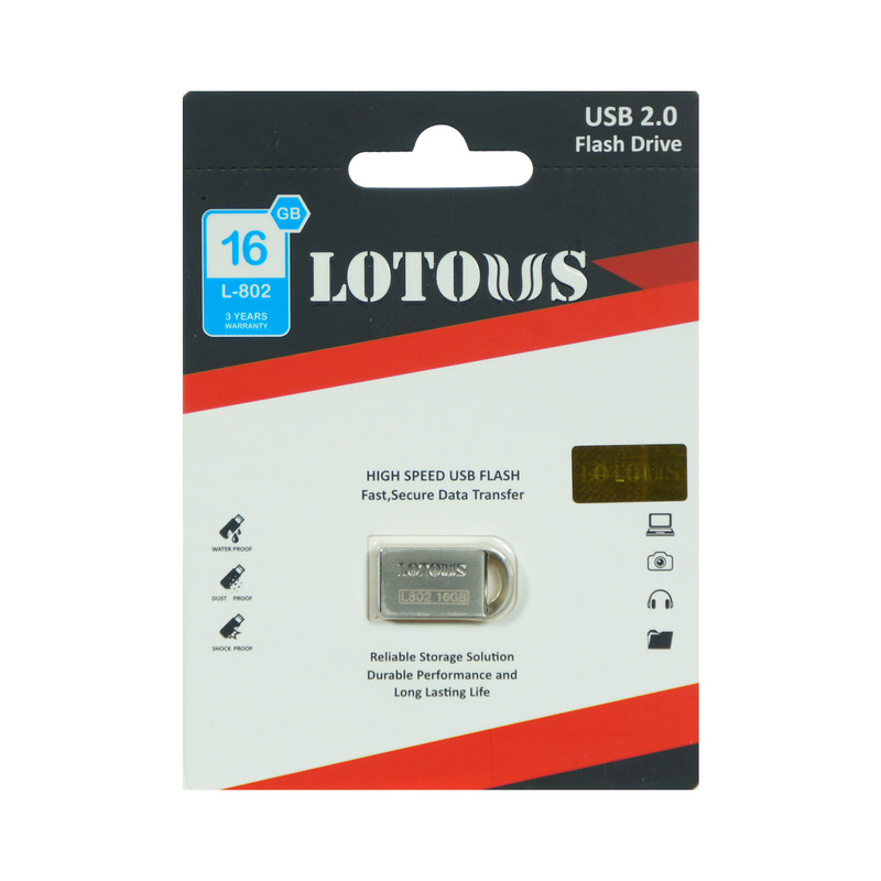 لوتوس با در بر داشتن سهم عمده ای از بازار USB Flash و Memory Cards مفتخر است که بهترین کیفیت،بالاترین تنوع در محصولات و معتبرترین خدمات پس از فروش را به مشتریان خود ارائه میدهد. فلش مموری لوتوس مدل L802 با سیستم عاملهای ویندوز Windows 8.1, Windows 8, Windows 7, Windows Vista , Mac OS 9.0 and above, Linux 2.4 سازگار است. این ذخیرهکننده از سرعت خواندن 50 مگابایت برثانیه و سرعت نوشتن 20 مگابایت برثانیه برخوردار است و از تکنولوژی پشتیبانی از حالت صرفه جویی در انرژی بهره میبرد.فلش مموری لوتوس مدل L802 علی الرغم استفاده از رابط USB 2 ،سرعت انتقال بالایی دارد که به میزان قابل توجهی عملکرد انتقال اطلاعات را بهبود داده است. همچنین این محصول با رابط USB 2.0 و USB 1.1 سازگار است. جنس بدنه این فلش مموری از فلز می باشد. از مزیت های خوب این فلش می توان به ضدآب، ضد ضربه، ضد گرد و غبار اشاره کرد. این ویژگی ها توانسته فلش لوتوس را در بین کاربران محبوب کند. فلش لوتوس از تکنولوژی MICRO COB بهره می برد که نسبت به فلش های معمولی از قابلیت و ویژگی های منحصر به فردی برخوردار می باشد.