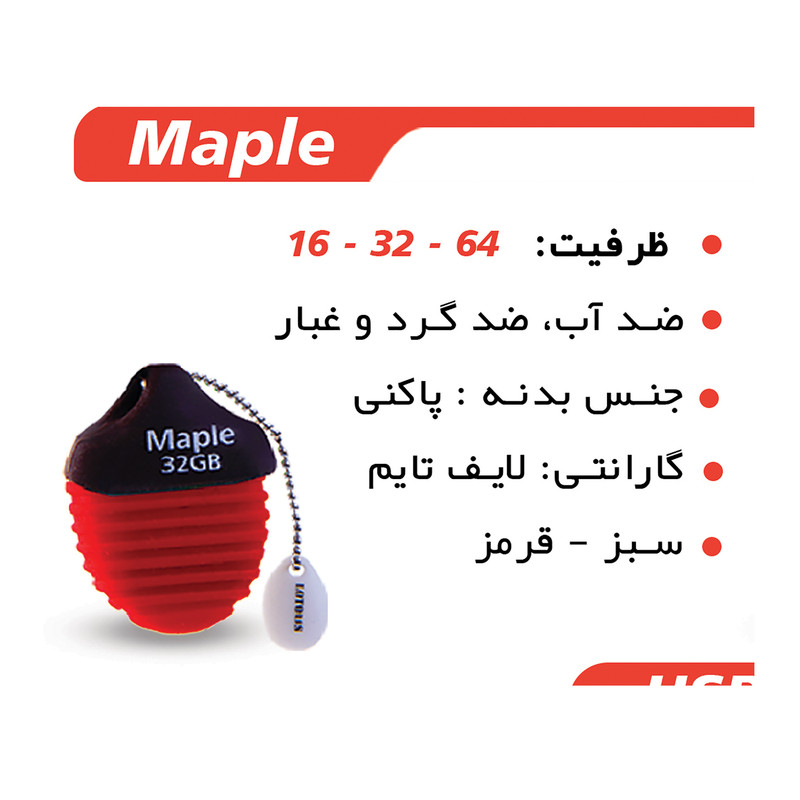 لوتوس با در بر داشتن سهم عمده ای از بازار USB Flash و Memory Cards مفتخر است که بهترین کیفیت،بالاترین تنوع در محصولات و معتبرترین خدمات پس از فروش را به مشتریان خود ارائه میدهد. فلش مموری لوتوس مدل Maple با سیستم عاملهای ویندوز Windows 8.1, Windows 8, Windows 7, Windows Vista , Mac OS 9.0 and above, Linux 2.4 سازگار است. این ذخیرهکننده از سرعت خواندن 50 مگابایت برثانیه و سرعت نوشتن 20 مگابایت برثانیه برخوردار است و از تکنولوژی پشتیبانی از حالت صرفه جویی در انرژی بهره میبرد.فلش مموری لوتوس مدل Maple علی الرغم استفاده از رابط USB 2 ،سرعت انتقال بالایی دارد که به میزان قابل توجهی عملکرد انتقال اطلاعات را بهبود داده است. همچنین این محصول با رابط USB 2.0 و USB 1.1 سازگار است. جنس بدنه این فلش مموری از سیلیکون می باشد. از مزیت های خوب این فلش می توان به ضدآب و ضد گرد و غبار اشاره کرد. این ویژگی ها توانسته فلش لوتوس را در بین کاربران محبوب کند. فلش لوتوس از تکنولوژی MICRO COB بهره می برد که نسبت به فلش های معمولی از قابلیت و ویژگی های منحصر به فردی برخوردار می باشد.